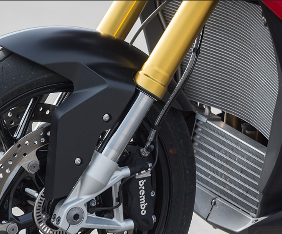 La suspensión delantera, comúnmente conocida como horquilla, es la parte más visible de la suspensión de una motocicleta. Consiste en un par de tubos que conectan la rueda delantera al cuadro y que contienen amortiguadores y resortes.